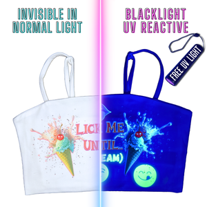 The UV-reactive art stays completely hidden in regular light and comes to life under blacklights or UV light. (Free UV light included with every order!)