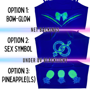 Speaking of the Net-Back, we’ve got 3 different UV options for you to choose from. All options remain invisible until you're under UV light. Check the pictures for details.