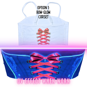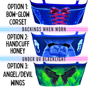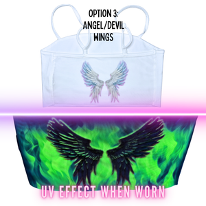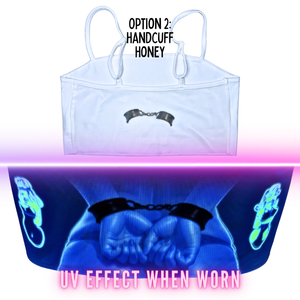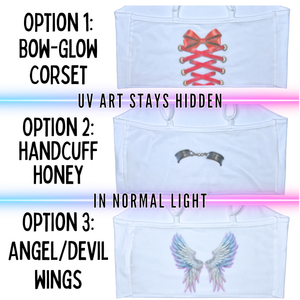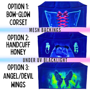 The back of this top is made of see-through Mesh that leaves little to the imagination, until the UV lights hit! An effect you've gotta see to believe... and even then, they might not believe what they're seeing. With 3 mesh-merizing styles to choose from(dad joke!) Check the pictures and choose your style.
